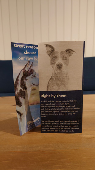 2. For the brochure I decided to do a tri-fold style in size A4. I started by creating a low-fidelity layout on a piece of paper and laying out a rough plan for the brochure. I wanted to use photos of dogs that are similar to wolves to fit better with my logo. The color palette is in different shades of blue and white, borrowed from the images. I used Karol Sans bold font for titles and book for small text. I strategically chose the images and illustrations. On the inside the dog is facing the information, leading the reader's attention to the information on the infographic, and the dog illustrations are facing the opposite way to draw the viewer's eye back on the page, instead of away from it. The front cover has two images of dogs looking at the reader. This aims to portray the seriousness and trust customers can have for the company. Here is the full brochure: